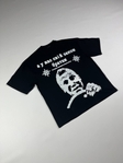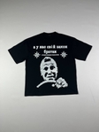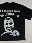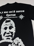 Чорна оверсайз футболка з потужним графічним принтом “А у нас свій закон, братан” — це справжній стейтмент для тих, хто любить жорстку естетику, вуличну іронію та характерні культурні відсилки. Дизайн виконаний у стилі сирої контрастної графіки: зображення чоловічого обличчя за кермом, масивні букви, стилізовані зірки та фраза, що одразу створює атмосферу кримінального гумору й пострадянського вайбу.
